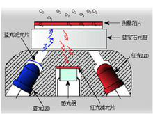 熒光法溶解氧測量儀基于熒光猝熄原理。藍光照射到熒光物質上使熒光物質激發并發出紅光,由于氧分子可以帶走能量(猝熄效應),所以激發的紅光的時間和強度與氧分子的濃度成反比。通過測量激發紅光與參比光的相位差,并與內部標定值對比,從而可計算出氧分子的濃度。在過去的50多年里,一直采用電流法和極譜法測量溶解氧。這種方法對于市政和工業