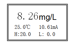 DO值為主顯示,溫度值、高低報警設置值及電流值為副顯示。正上方為當前測量值,25.0℃為當前溫度值,H:20.0為高點報警值,L: 0.0為低點報警值,D: 0.0為滯后量。