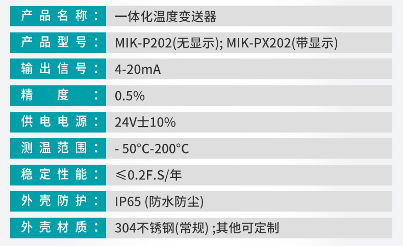 MIK-P202是鎧裝溫度變送器。信號處理可以選擇不同的內(nèi)置變送器模塊,以滿足用戶的各種應(yīng)用要求。