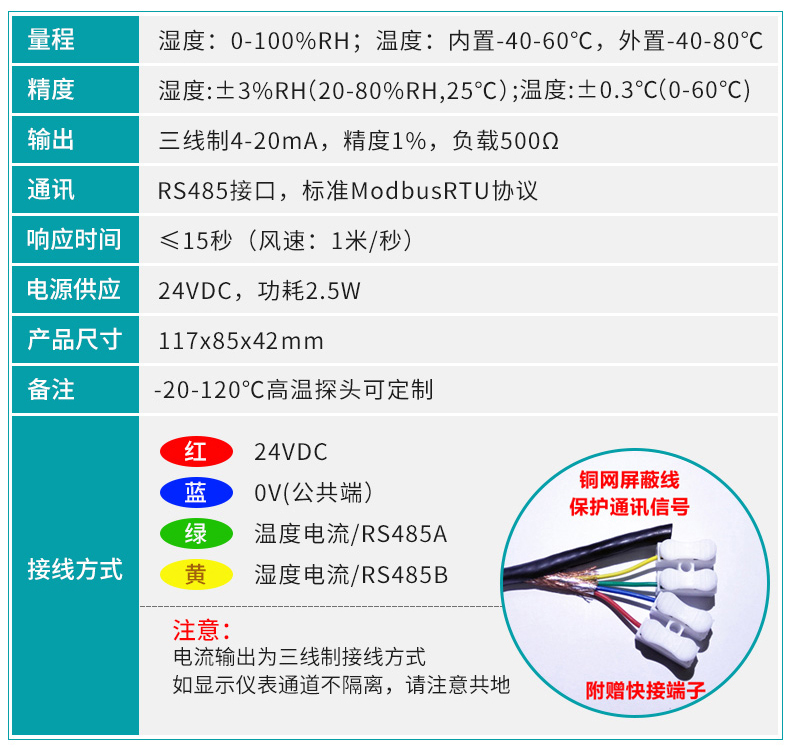 本產品為工業溫濕度變送器,可選內置探頭和外置探頭,監測環境空氣溫度和濕度參數,變送為電流、電壓輸出或使用 RS485 通訊接口數字輸出,可配實時數碼顯示。